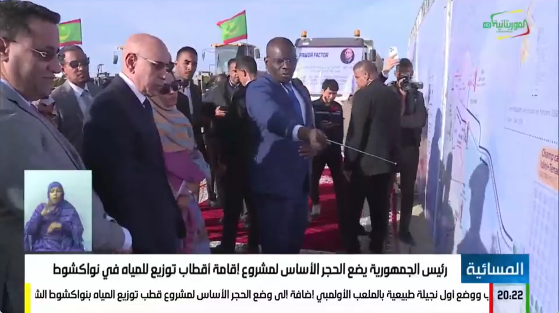 當地時間12月22日,毛里塔尼亞總統穆罕默德·烏爾德·謝赫·加茲瓦尼出席電建港航公司承建的毛塔首都北部配水中心LotB項目奠基儀式。這也是加茲瓦尼總統今年第三次親臨公司項目現場,體現了毛里塔尼亞政府對中國電建的高度信任與認可。 奠基儀式前,加茲瓦尼總統一行深入項目現場,實地檢查施工區域規劃與前期準備工作,詳細了解現場設備配置及人員情況。隨后,總統聽取了項目整體情況匯報,全面了解工程總體布局、建設內容及實施計劃。 加茲瓦尼總統強調,首都配水中心Lot B項目是毛里塔尼亞重點工程,對改善民生、加強城市基礎設施建設、保障區域供水安全具有重要意義。他指出,項目建成后將大幅提升首都北部片區及機場區域的供水調配能力,為當地居民提供更加安全、穩定、可持續的用水保障,有力促進經濟社會發展、提高居民生活質量。 毛里塔尼亞總統慰問公司員工 毛里塔尼亞國家電視臺全程報道 |